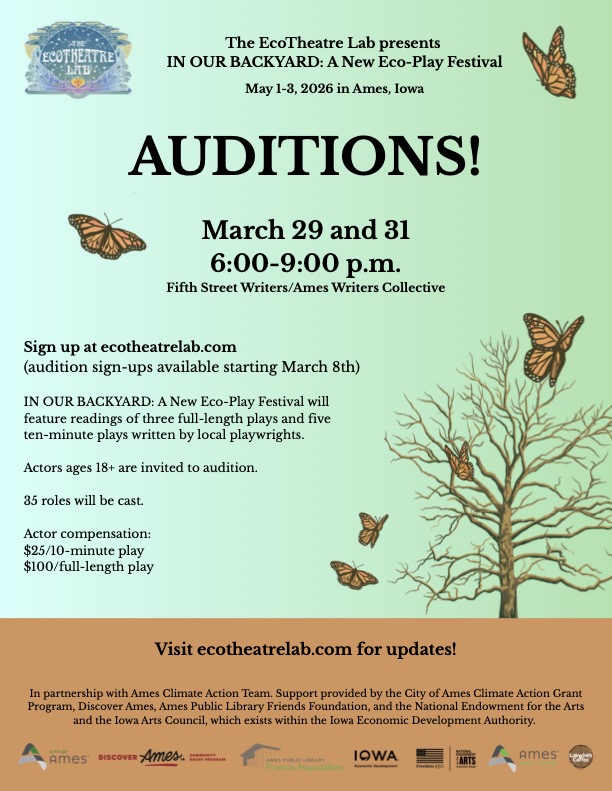 March 29th & 31st: Auditions for The EcoTheatre Lab's new eco-play festival, In Our Backyard. Auditions are open to the public, ages 18+.