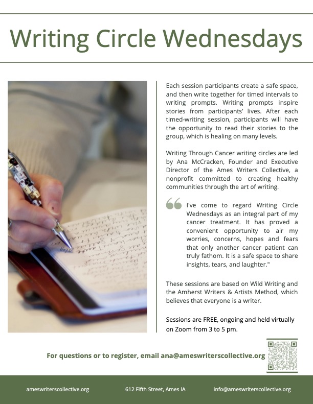 These sessions are led by Ana McCracken, founder of the Ames Writers Collective and held in partnership with the William R. Bliss Cancer Center located in Ames, Iowa. Registration is free and required. Contact Ana for questions and to register.